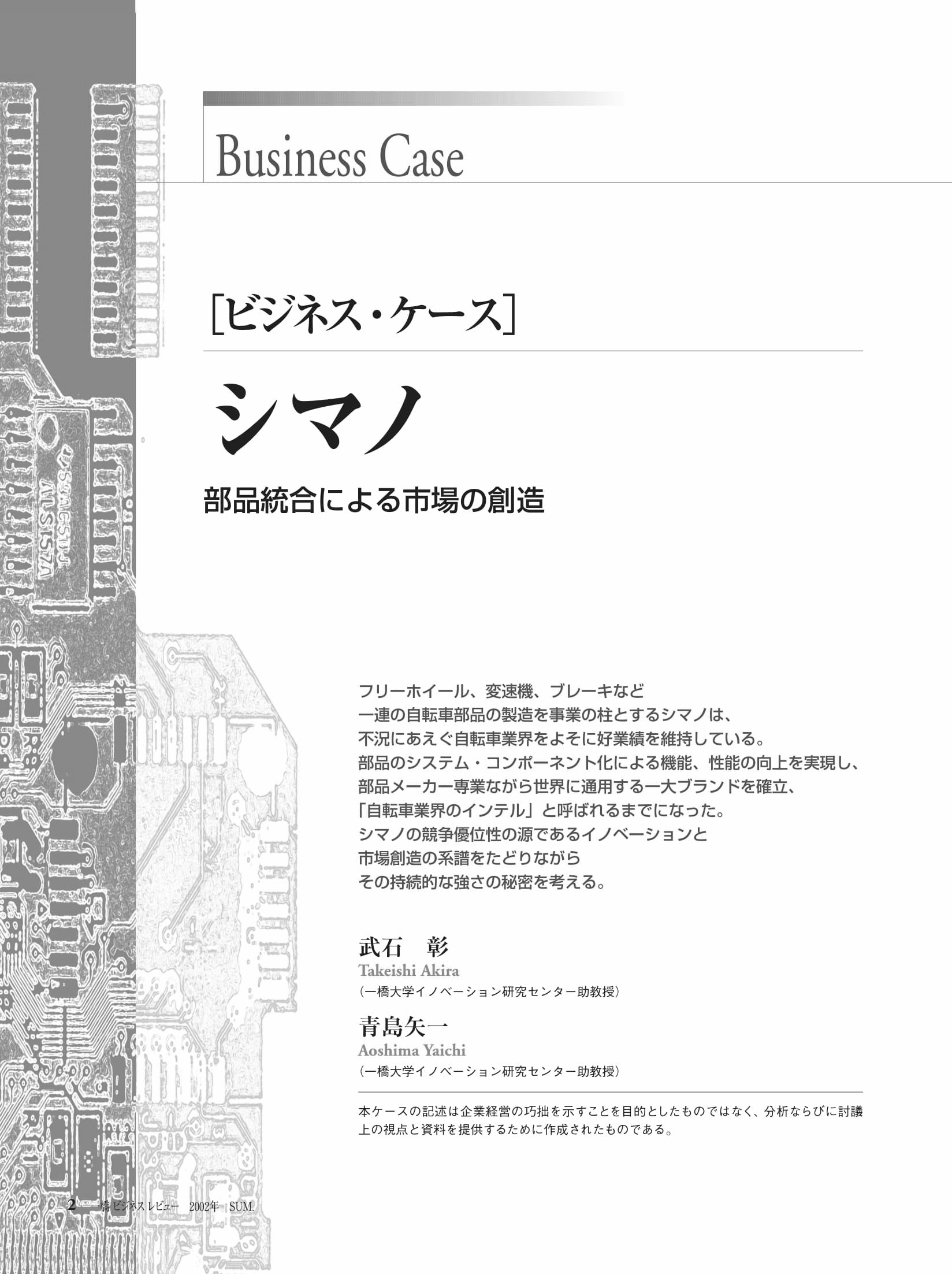 フリーホイール、変速機、ブレーキなど一連の自転車部品の製造を事業の柱とするシマノは、不況にあえぐ自転車業界をよそに好業績を維持している。部品のシステム・コンポーネント化による機能、性能の向上を実現し、部品メーカー専業ながら世界に通用する一大ブランドを確立、「自転車業界のインテル」と呼ばれるまでになった。シマノの競争優位性の源であるイノベーションと市場創造の系譜をたどりながらその持続的な強さの秘密を考える。