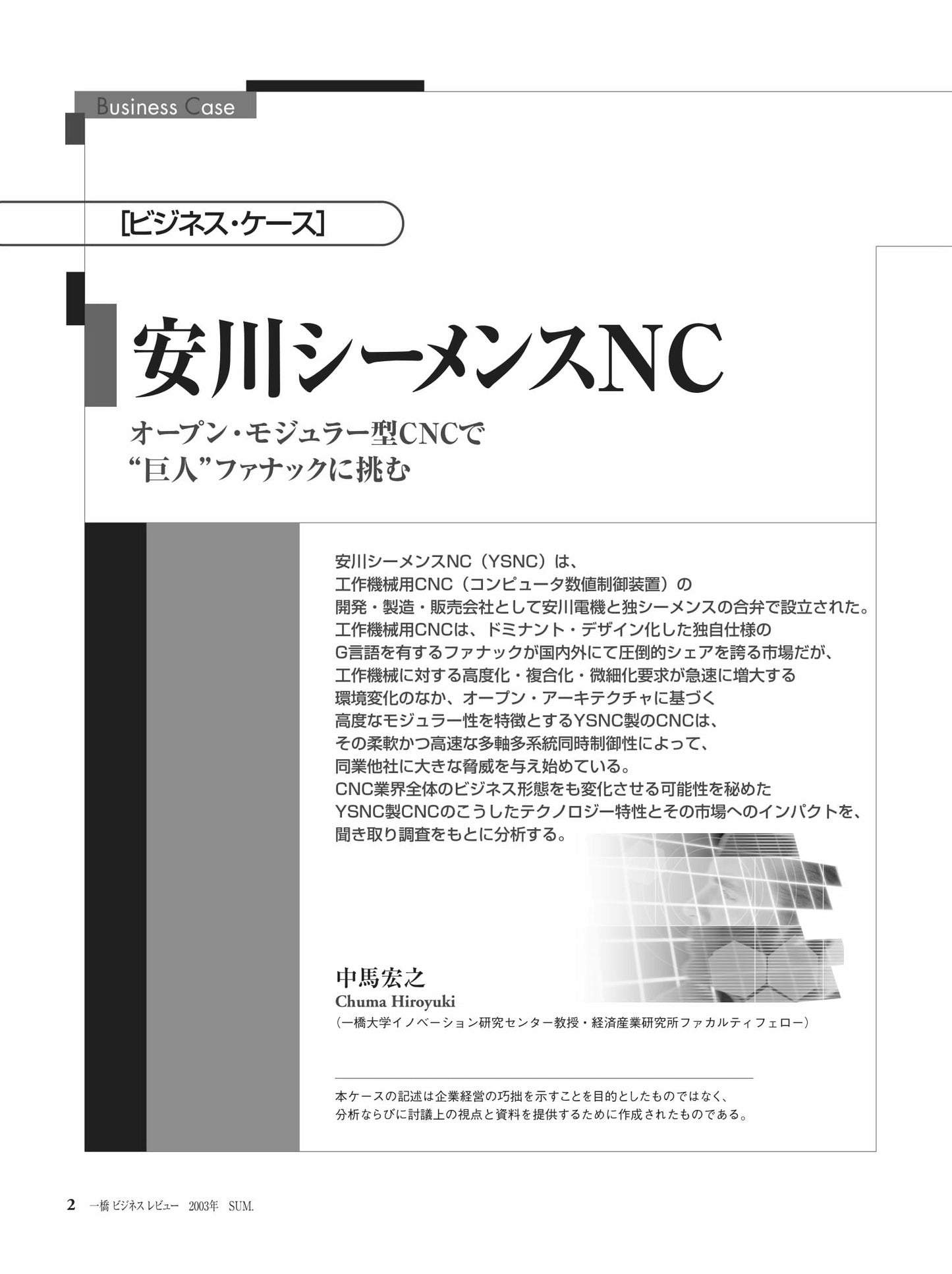 安川シーメンスNC(YSNC)は、工作機械用CNC(コンピュータ数値制御装置)の開発・製造・販売会社として安川電機と独シーメンスの合弁で設立された。工作機械用CNCは、ドミナント・デザイン化した独自仕様のG言語を有するファナックが国内外にて圧倒的シェアを誇る市場だが、工作機械に対する高度化・複合化・微細化要求が急速に増大する環境変化のなか、オープン・アーキテクチャに基づく高度なモジュラー性を特徴とするYSNC製のCNCは、その柔軟かつ高速な多岐多系統同時制御性によって、同業他社に大きな脅威を与え始めている。CNC業界全体のビジネス形態をも変化させる可能性を秘めたYSNC製CNCのこうしたテクノロジー特性とその市場へのインパクトを、聞き取り調査をもとに分析する。