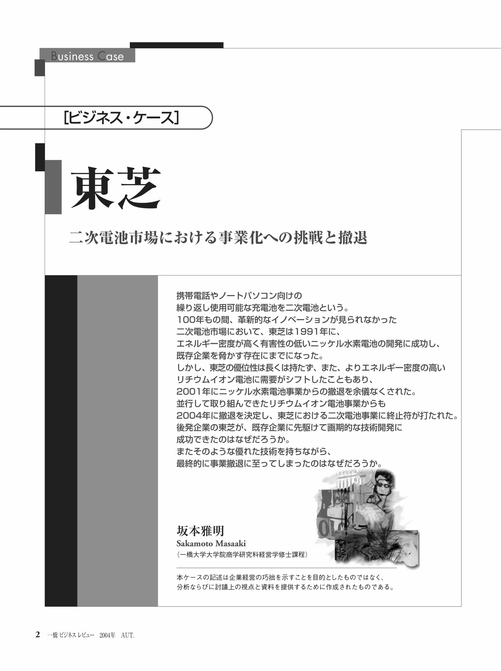携帯電話やノートパソコン向けの繰り返し使用可能な充電池を二次電池という。100年もの間、革新的なイノベーションが見られなかった二次電池市場において、東芝は1991年に、エネルギー密度が高く有害性の低いニッケル水素電池の開発に成功し、既存企業を脅かす存在にまでになった。しかし、東芝の優位性は長くは持たず、また、よりエネルギー密度の高いリチウムイオン電池に需要がシフトしたこともあり、2001年にニッケル水素電池事業からの撤退を余儀なくされた。並行して取り組んできたリチウムイオン電池事業からも2004年に撤退を決定し、東芝における二次電池事業に終止符が打たれた。後発企業の東芝が、既存企業に先駆けて画期的な技術開発に成功できたのはなぜだろうか。またそのような優れた技術を持ちながら、最終的に事業撤退に至ってしまったのはなぜだろうか。