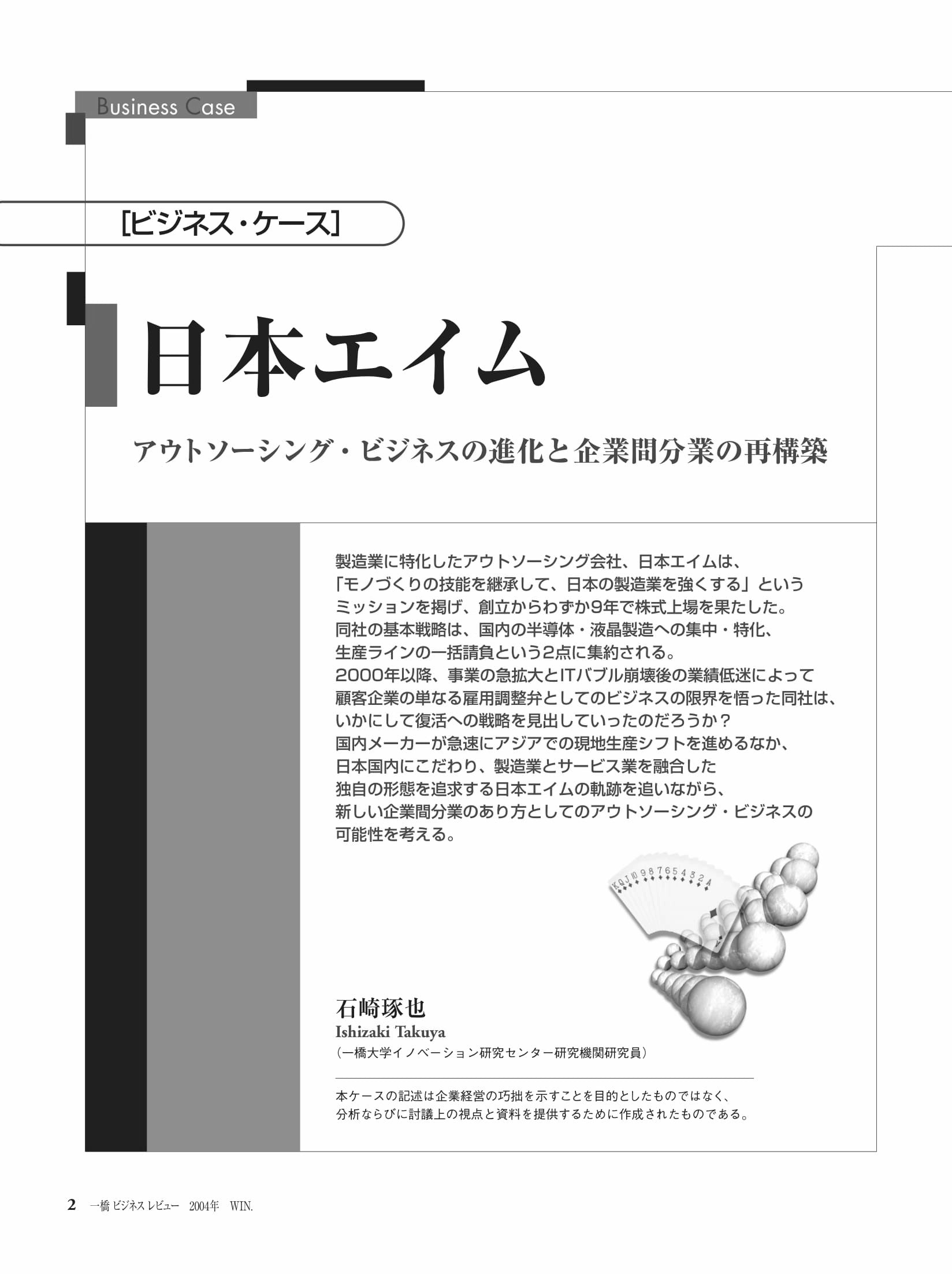 製造業に特化したアウトソーシング会社、日本エイムは、「モノづくりの技能を継承して、日本の製造業を強くする」というミッションを掲げ、創立からわずか9年で株式上場を果たした。同社の基本戦略は、国内の半導体・液晶製造への集中・特化、生産ラインの一括請負という2点に集約される。2000年以降、事業の急拡大とITバブル崩壊後の業績低迷によって顧客企業の単なる雇用調整弁としてのビジネスの限界を悟った同社は、いかにして復活への戦略を見出していったのだろうか?国内メーカーが急速にアジアでの現地生産シフトを進めるなか、日本国内にこだわり、製造業とサービス業を融合した独自の形態を追及する日本エイムの軌跡を追いながら、新しい企業間分業のあり方としてのアウトソーシング・ビジネスの可能性を考える。