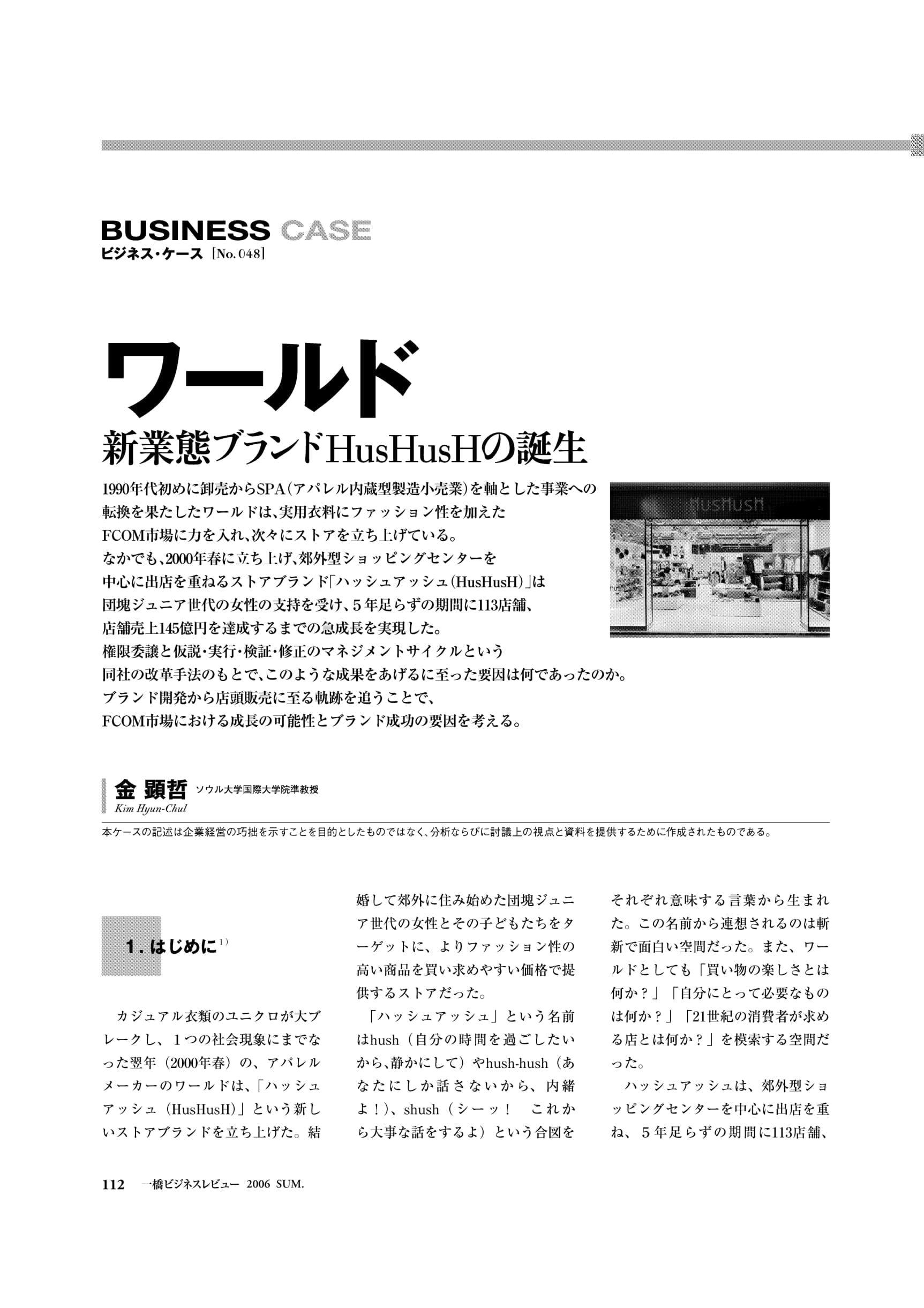 1990年代初めに卸売からSPA(アパレル内蔵型製造小売業)を軸とした事業への転換を果たしたワールドは、実用衣料にファッション性を加えたFCOM市場に力を入れ、次々にストアを立ち上げている。なかでも、2000年春に立ち上げ、郊外型ショッピングセンターを中心に出店を重ねるストアブランド「ハッシュアッシュ(HusHusH)」は団塊ジュニア世代の女性の支持を受け、5年足らずの期間に113店舗、店舗売上145億円を達成するまでの急成長を実現した。権限委譲と仮説・実行・検証・修正のマネジメントサイクルという同社の改革手法のもとで、このような成果をあげるに至った要因は何であったのか。ブランド開発から店頭販売に至る軌跡を追うことで、FCOM市場における成長の可能性とブランド成功の要因を考える。