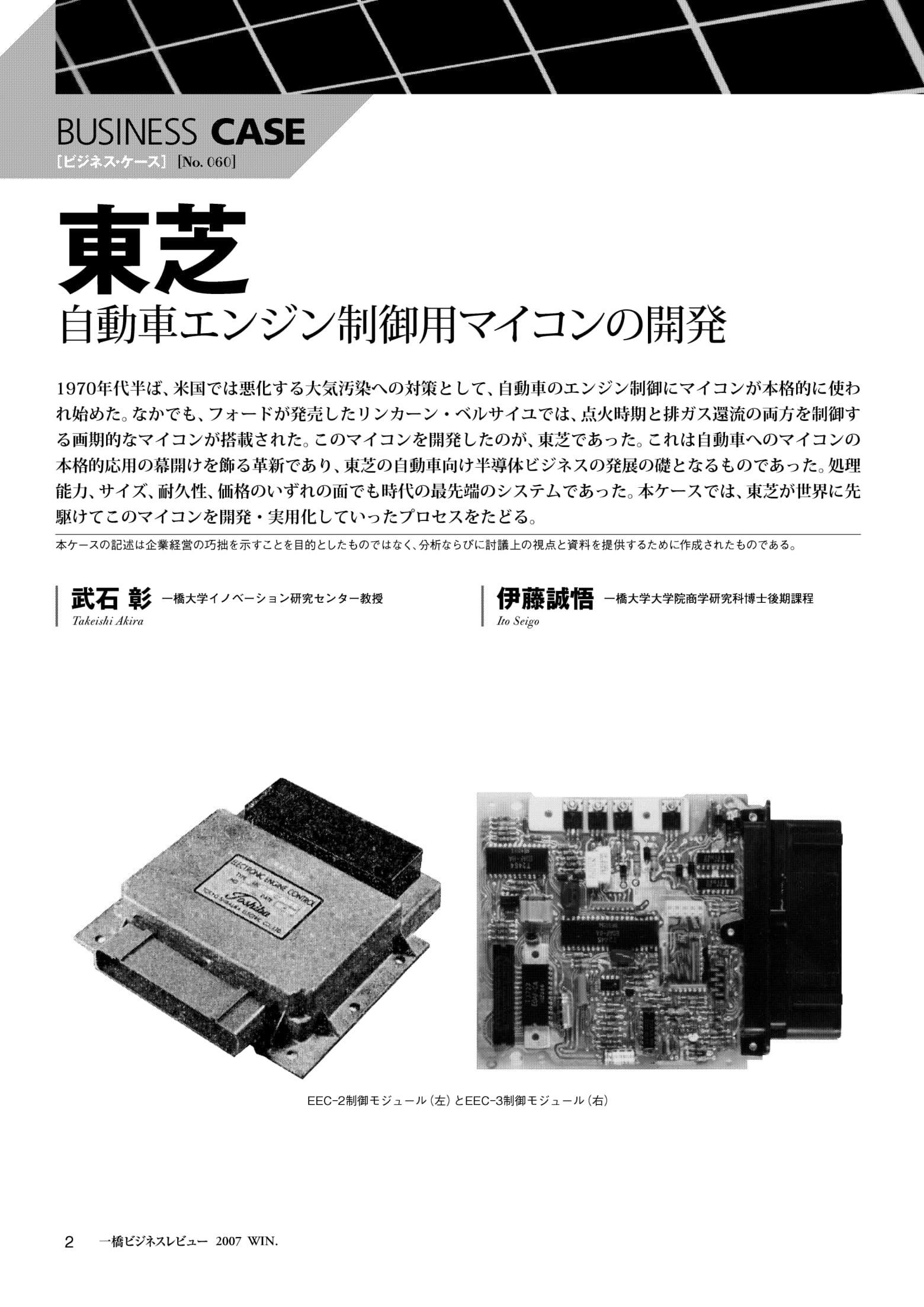 1970年代半ば、米国では悪化する大気汚染への対策として、自動車のエンジン制御にマイコンが本格的に使われ始めた。なかでも、フォードが発売したリンカーン・ベルサイユでは、点火時期と排ガス還流の両方を制御する画期的なマイコンが搭載された。このマイコンを開発したのが、東芝であった。これは自動車へのマイコンの本格的応用の幕開けを飾る革新であり、東芝の自動車向け半導体ビジネスの発展の礎となるものであった。処理能力、サイズ、耐久性、価格のいずれの面でも時代の最先端のシステムであった。本ケースでは、東芝が世界に先駆けてこのマイコンを開発・実用化していったプロセスをたどる。