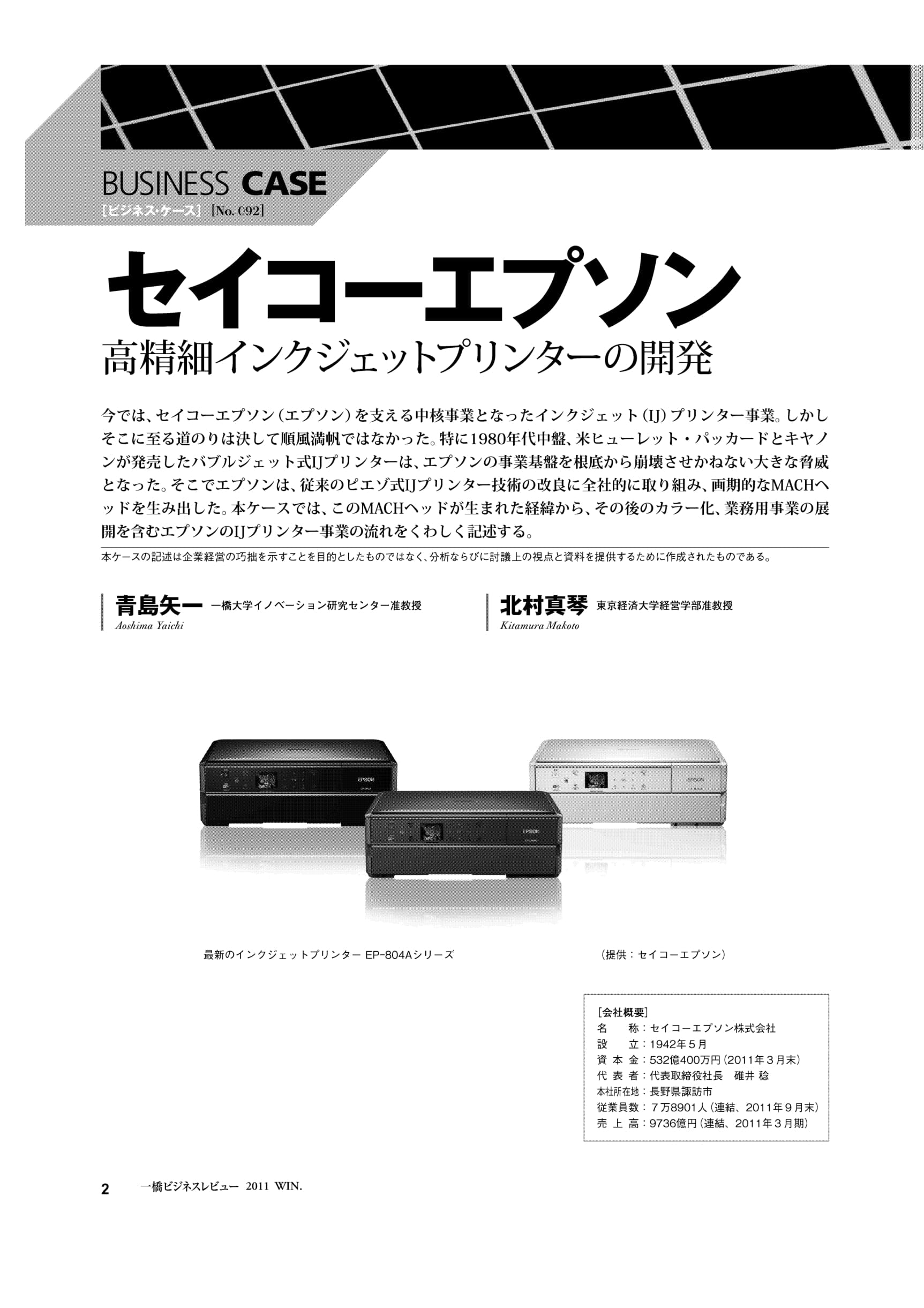 今では、セイコーエプソン(エプソン)を支える中核事業となったインクジェット(IJ)プリンター事業。しかしそこに至る道のりは決して順風満帆ではなかった。特に1980年代中盤、米ヒューレット・パッカードとキヤノンが発売したバブルジェット式IJプリンターは、エプソンの事業基盤を根底から崩壊させかねない大きな脅威となった。そこでエプソンは、従来のピエゾ式IJプリンター技術の改良に全社的に取り組み、画期的なMACHヘッドを生み出した。本ケースでは、このMACHヘッドが生まれた経緯から、その後のカラー化、業務用事業の展開を含むエプソンのIJプリンター事業の流れをくわしく記述する。
