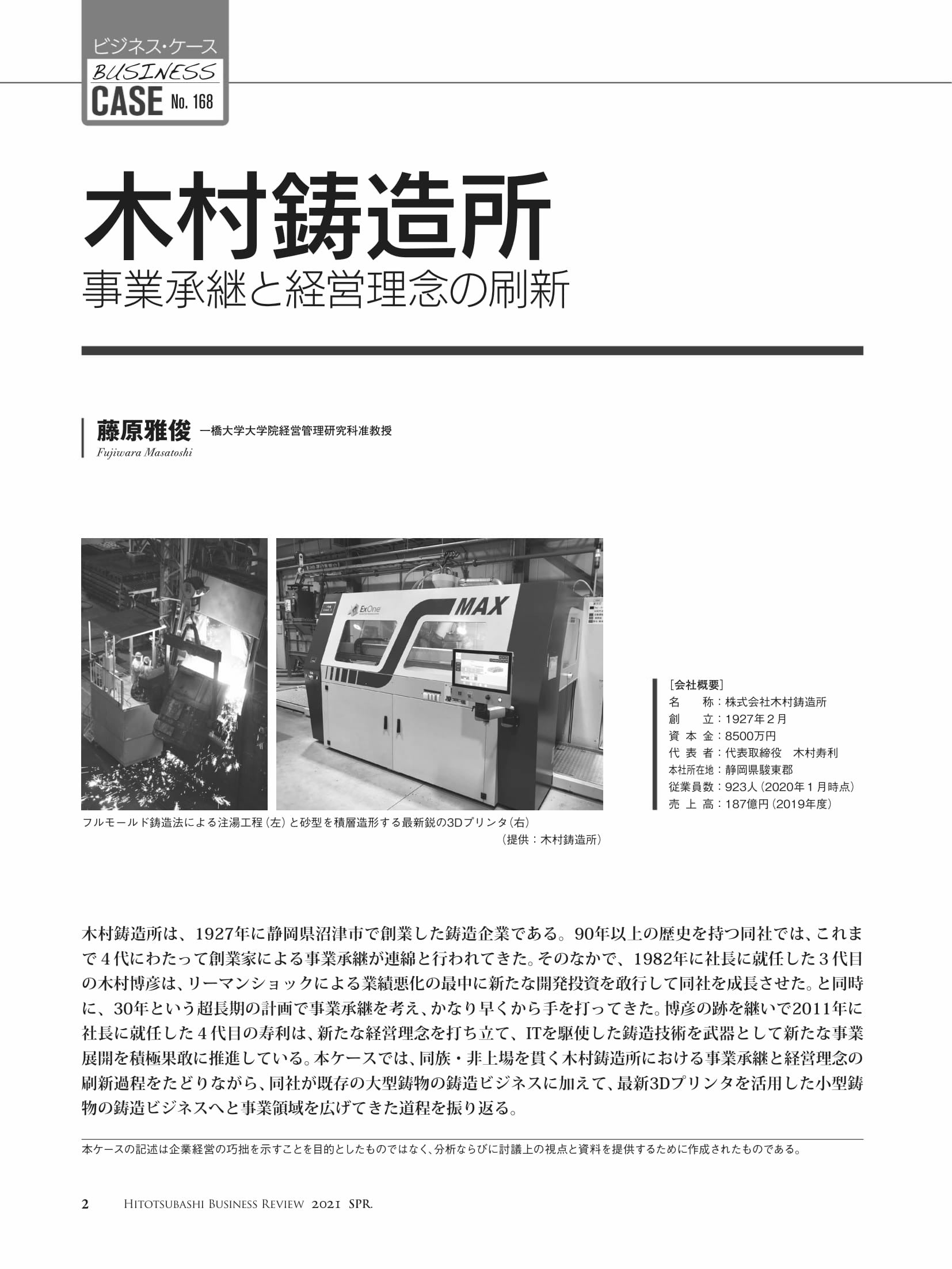 木村鋳造所は、1927年に静岡県沼津市で創業した鋳造企業である。90年以上の歴史を持つ同社では、これまで4代にわたって創業家による事業承継が連綿と行われてきた。そのなかで、1982年に社長に就任した3代目の木村博彦は、リーマンショックによる業績悪化の最中に新たな開発投資を敢行して同社を成長させた。と同時に、30年という超長期の計画で事業承継を考え、かなり早くから手を打ってきた。博彦の跡を継いで2011年に社長に就任した4代目の寿利は、新たな経営理念を打ち立て、ITを駆使した鋳造技術を武器として新たな事業展開を積極果敢に推進している。本ケースでは、同族・非上場を貫く木村鋳造所における事業承継と経営理念の刷新過程をたどりながら、同社が既存の大型鋳物の鋳造ビジネスに加えて、最新3Dプリンタを活用した小型鋳物の鋳造ビジネスへと事業領域を広げてきた道程を振り返る。