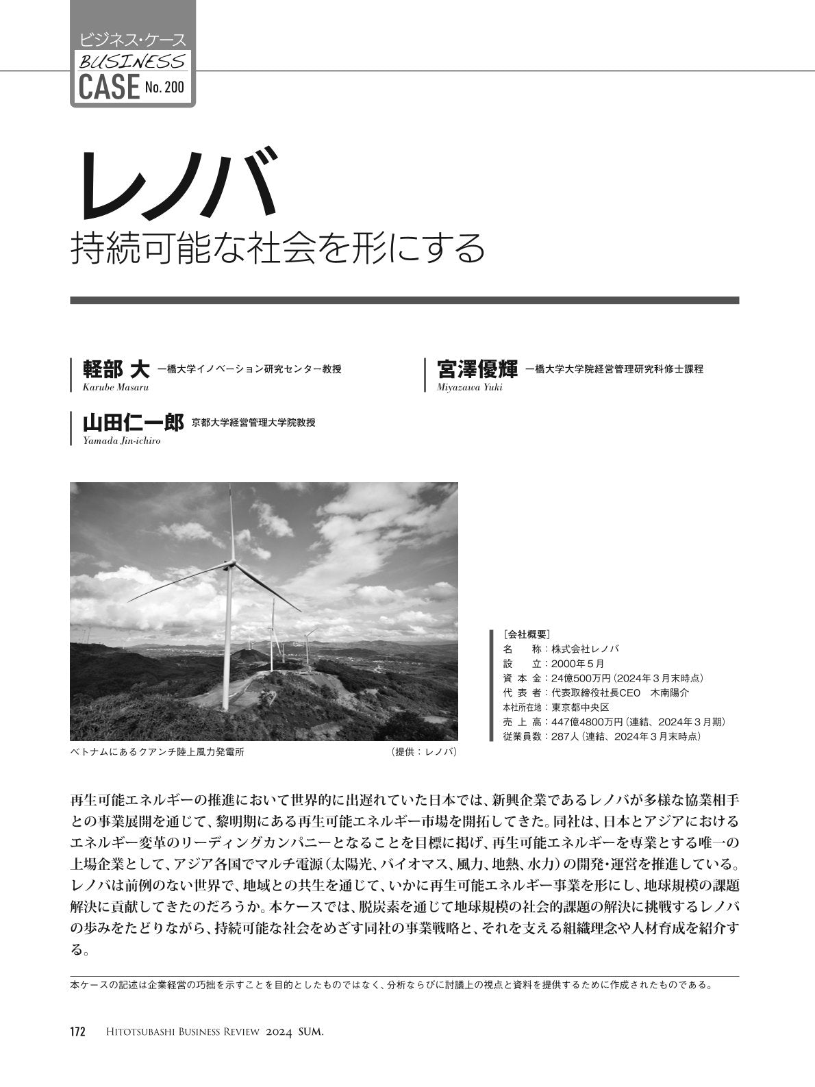 再生可能エネルギーの推進において世界的に出遅れていた日本では、新興企業であるレノバが多様な協業相手との事業展開を通じて、黎明期にある再生可能エネルギー市場を開拓してきた。同社は、日本とアジアにおけるエネルギー変革のリーディングカンパニーとなることを目標に掲げ、再生可能エネルギーを専業とする唯一の上場企業として、アジア各国でマルチ電源(太陽光、バイオマス、風力、地熱、水力)の開発・運営を推進している。レノバは前例のない世界で、地域との共生を通じて、いかに再生可能エネルギー事業を形にし、地球規模の課題解決に貢献してきたのだろうか。本ケースでは、脱炭素を通じて地球規模の社会的課題の解決に挑戦するレノバの歩みをたどりながら、持続可能な社会をめざす同社の事業戦略と、それを支える組織理念や人材育成を紹介する。