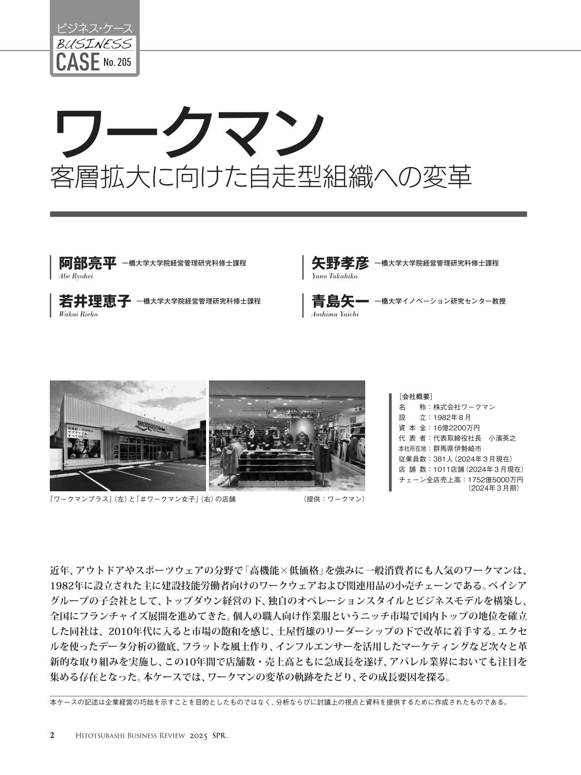 近年、アウトドアやスポーツウェアの分野で「高機能×低価格」を強みに一般消費者にも人気のワークマンは、1982年に設立された主に建設技能労働者向けのワークウェアおよび関連用品の小売チェーンである。ベイシアグループの子会社として、トップダウン経営の下、独自のオペレーションスタイルとビジネスモデルを構築し、全国にフランチャイズ展開を進めてきた。個人の職人向け作業服というニッチ市場で国内トップの地位を確立した同社は、2010年代に入ると市場の飽和を感じ、土屋哲雄のリーダーシップの下で改革に着手する。エクセルを使ったデータ分析の徹底、フラットな風土作り、インフルエンサーを活用したマーケティングなど次々と革新的な取り組みを実施し、この10年間で店舗数・売上高ともに急成長を遂げ、アパレル業界においても注目を集める存在となった。本ケースでは、ワークマンの変革の軌跡をたどり、その成長要因を探る。